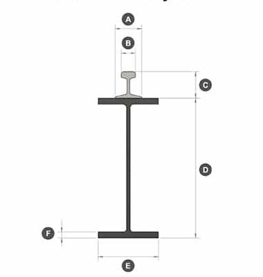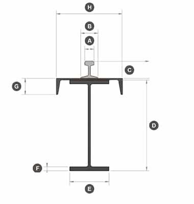 Rail Width (A) Runway Beam Chart (B) Width of the rail head (C) Height of the rails (D) Beam Height on the Runway (E) Flange Width of Runway Beams (F) Flange Thickness of Runway Beams (G) Toe Channel Cap (H) Width of the channel cap