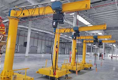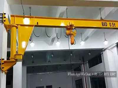 The lifting mechanism for this type of travelling lightweight jib crane is an electric wire rope hoist or a chain hoist, which should be chosen based on the material lifting requirements.