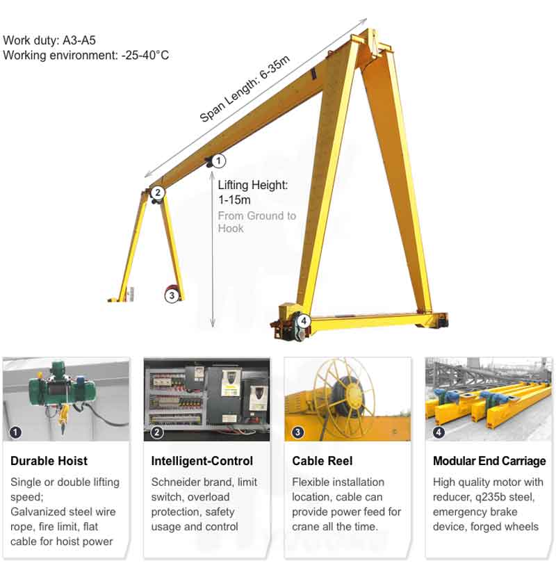 A gantry crane is a type of overhead bridge crane in which the bridge frame is supported by gantry legs running on the ground track at both ends of gantry beam. It consists primarily of a gantry frame (main beam, end beam, leg, lower cross beam, trolley running track, and cab), a hoist trolley, a crane running mechanism, and an electrical control system. Check more on gantry crane kit.