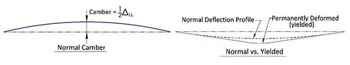However, the girder camber will be lost if the loads surpass the yield strength by more than 10%. When it is loaded with the rated capacity of the loads, it will deflect the normal incremental amount, and the stress will be at the normal level, except that the beginning point for the deflection increment will be at a lower elevation due to the lost camber. The girder camber will be lost each time the girder is loaded above its yield strength, resulting in permanent deformation, as seen in the diagram below: