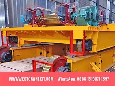 The trolley traveling mechanism of casting bridge crane adopts centralized driving two wheels plan. It is powered by an electric motor. The power is then transferred to the reducer via the gear coupling and driving shaft. The machine will then be dragged to complete the longitudinal motion. It is equipped with a rail cleaner on the front end of the wheel, which aims to automatically clean the stumbling block on the surface of the rail in a convenient manner. It can ensure the crane's safety while traveling.