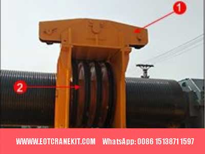 The lifting mechanism of the double girder overhead crane consists of an electric motor, a brake, a reducer, a drum, a pulley block, a hook group, steel wire rope, and other components. Driving by single electric motor and lowering the speed by reducer, then it drives the duplex drum. The materials are elevated using a steel wire rope coiling system composed of a fixed pulley and a movable block.