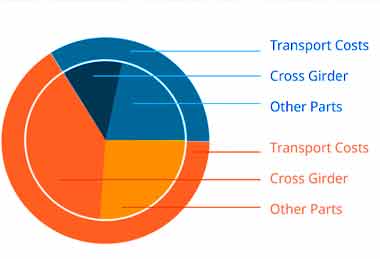 A quick check at the pie chart of overhead crane expenses on the left will reveal that the Cross Girder accounts for the most of the high transport costs. This section can be reduced, and then everything will be different. Thus, the Complete Crane System and Component Crane plans which referees to complete eot crane kit system but not including the main girder sale are presented below.