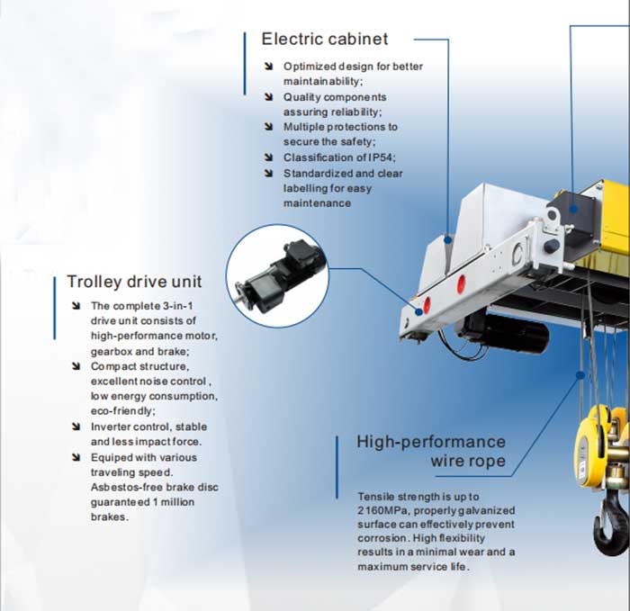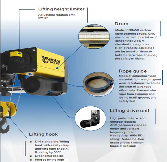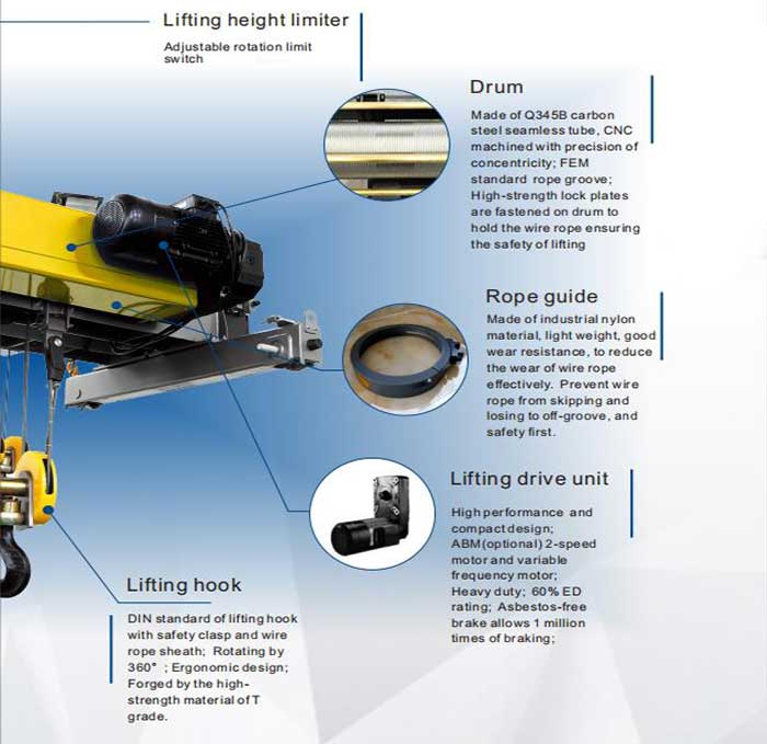 ND model FEM standard European wire rope electric hoist is newly developed with advanced design technology according to the latest national standard GB/T3811 "Design specification for cranes" , and with reference to European FEM standard . The whole set of single girder crane hoist is energy-saving and environment-friendly. With its advanced technology and cost-efficient feature , it is the most popular among the similar products .