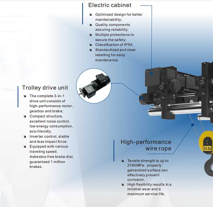 FEM standard double girder crane hoist designed according to the latest nationalstandard GB/T3811 "Design specications for cranes" , and with reference to European FEM standard , has the features of lightweight , modular design , and advanced manufacturing process . It greatly reduces the user's crane construction costs and crane operating costs , and improves the crane's overall quality and performance .