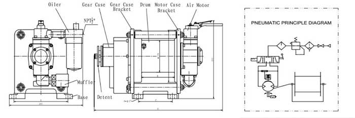 Vane air motor of blade pneumatic winch is made of motor case , cylinder, rotor, rotor vane , top bearing case ,and bottom bearing case, etc. After compressed air enter motor, the blade air winch will start to work. The controlling of compressed air inlet may change the revolving direction of air motor and the changing of current and pressure of compressed air will manage to get the suitable revolving speed and output torque.